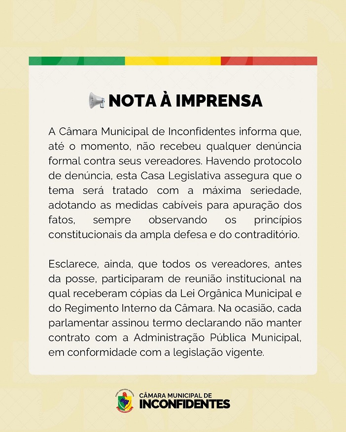 A Câmara Municipal de Inconfidentes informa que, até o momento, não recebeu qualquer denúncia formal contra seus vereadores. Havendo protocolo de denúncia, esta Casa Legislativa assegura que o tema será tratado com a máxima seriedade, adotando as medidas cabíveis para apuração dos fatos, sempre observando os princípios constitucionais a ampla defesa e do contraditório.