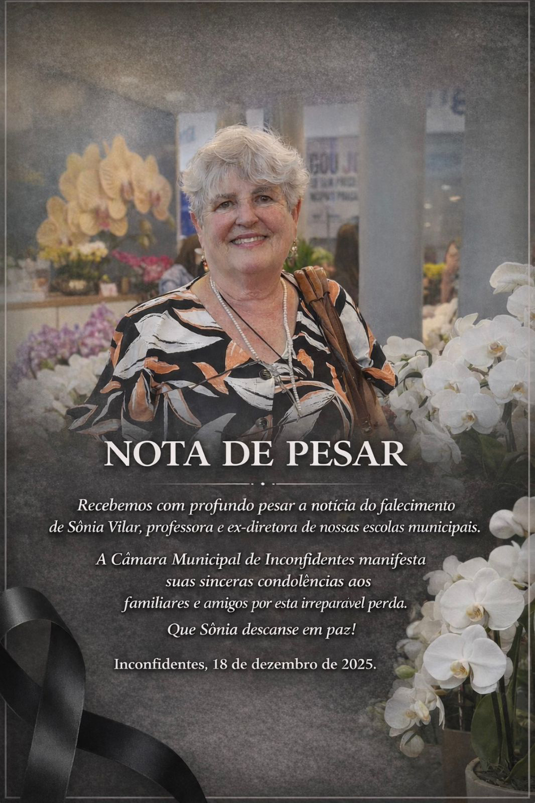 A Câmara Municipal de Inconfidentes, através de seu Presidente, José Acácio Bueno da Silva, manifesta o mais profundo pesar pelo falecimento da Sra. Sônia Vilar, professora e ex-diretora de nossas escolas municipais.