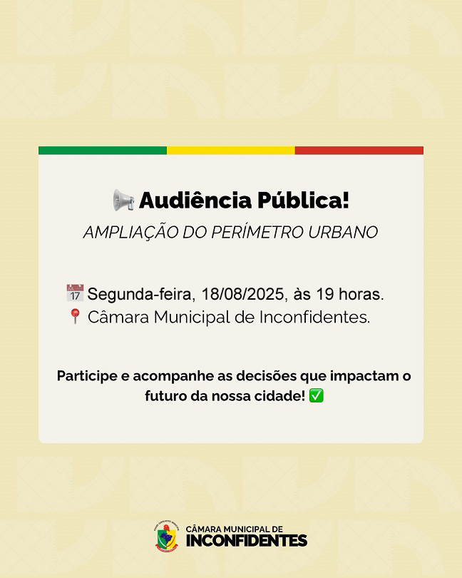 A Câmara Municipal de Inconfidentes convida toda a população para participar da Audiência Pública que irá discutir o Projeto de Lei do Prefeito Municipal que propõe a inclusão do bairro Monjolinho no perímetro urbano do município.